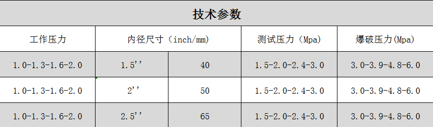 1. 該水帶編織層采用高強度滌綸紗和滌綸長絲混編,襯里為PU、PVC、EPDM